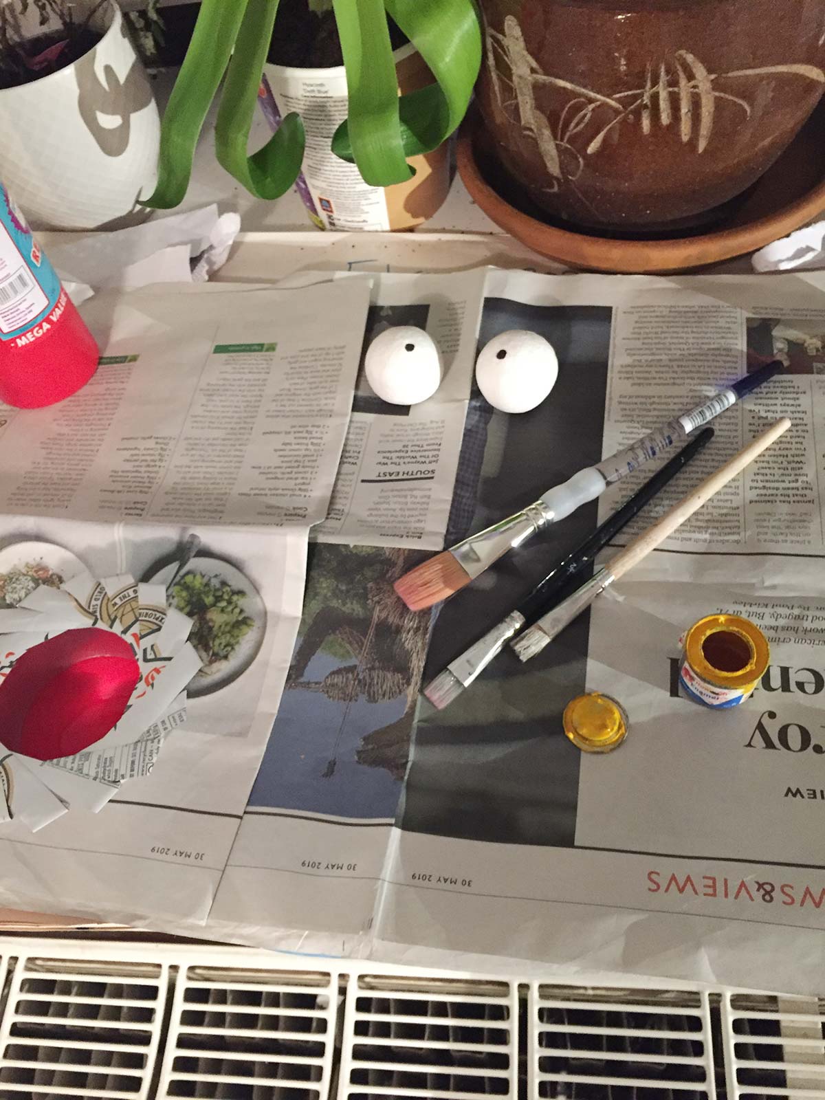 To create the eyes, I painted 2 mache balls. Once they tried, I glazed them with nail polish to give them shine. And after that, I glued them to some orange tissue paper, to keep them in place & to act as his ‘tear ducts’.